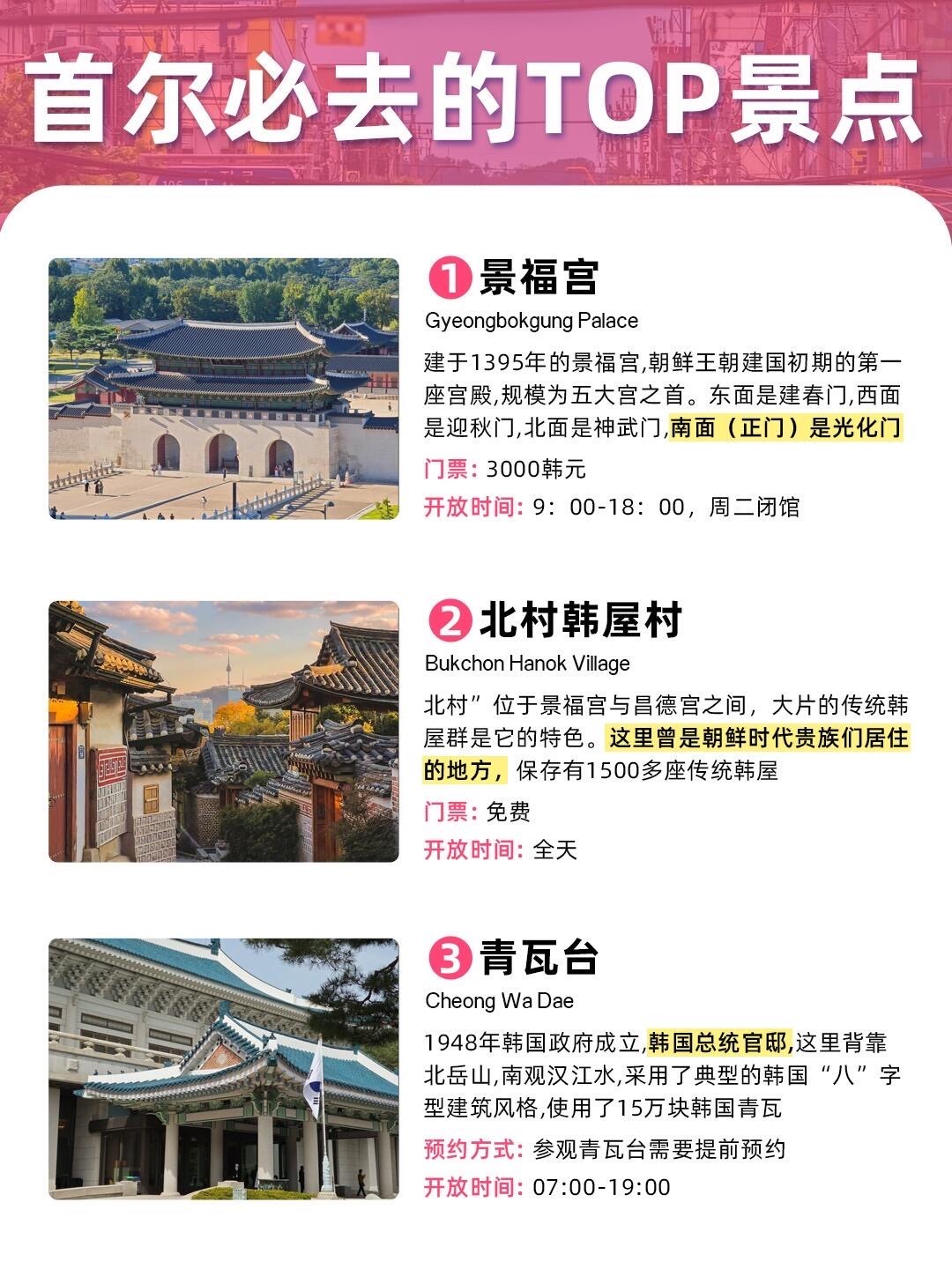 1、景福宮:作為首爾最著名的古建筑之一,景福宮是韓國的皇宮遺址,這里充滿了濃厚的文化氣息。